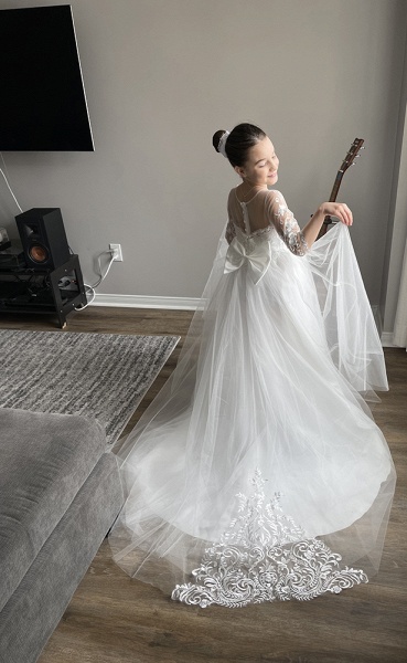 – طراحی ساده با جزئیات ظریف : برخلاف لباسهای عروس بزرگسالان، مدلهای بچهگانه معمولاً از طراحیهای پیچیدهتر پرهیز میکنند و بیشتر به جزئیات کوچک مثل گلهای کوچک، روبانها یا تزئینات ساده تکیه دارند.